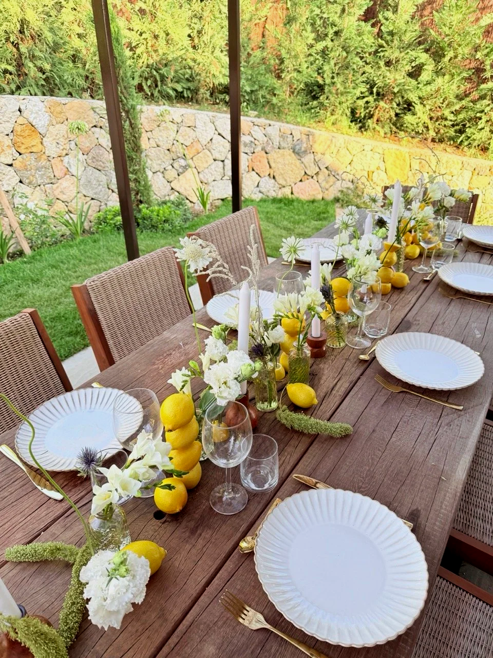 La mise en scène se veut florale, vivante et résolument conviviale, tout en conservant une harmonie visuelle parfaitement équilibrée. Chaque détail est pensé pour créer une atmosphère chaleureuse et raffinée, typique des réceptions haut de gamme sur la Côte d’Azur.